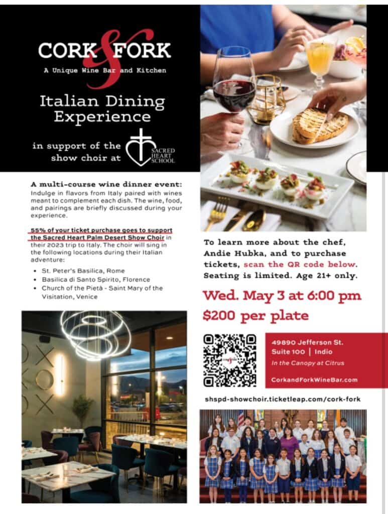 55% of every ticket purchased will go towards supporting the Sacred Heart Palm Desert Children’s Choir performances in Italy this upcoming December 2023.